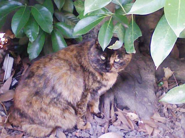 最近、お散歩コースで出会ったニューフェースです。 タヌキじゃないですよ♪ ネコですよ♪ 愛想よくニャーと話しかけてくるのに 何故か逃げ腰・・・。 携帯カメラのシャッター音にびっくりさせちゃったかなm(_ _"m) 野性味あふれるランダムな配色と お月さまのような丸顔が◎にかわいい子でした。